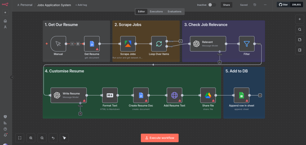 The workflow begins by loading your base resume so each run starts with a clean document. It then scrapes new roles from your chosen sources and passes every listing through an AI relevance check. Only the positions that align with your profile move forward.